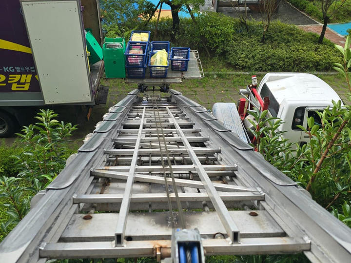 Интересно, что выносят вещи хозяев не через дверь, а через окно, используя специальные краны с выдвижными лестницами и движущейся по ней платформой. Андрей говорит, что может работать и в квартире на упаковке, и внизу, управляя платформой с помощью пульта, а также на погрузке.