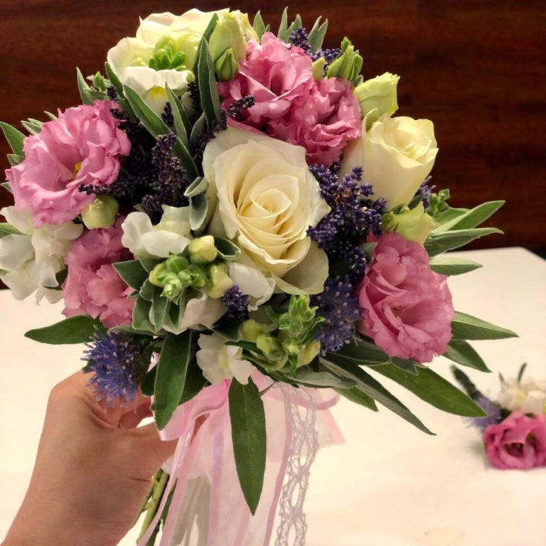 - «Каскад романтики»: эвкалипт, малиновые пионы, розовые ранункулюсы, белые диантусы, длинные ленты и кружево.