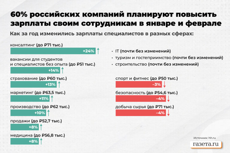 Между тем в конце 2022-го – начале 2023-го года уже зафиксирован рост зарплат в большинстве профессиональных групп. По сравнению с прошлой зимой больше всего выросли предлагаемые зарплаты в сфере консалтинга (на 24 %), в вакансиях для студентов и молодых специалистов без опыта (на 14 %), страховщиков (на 13 %), маркетологов (на 11 %), для производственного персонала (на 10 %), а также в сфере продаж и медицине (на 8 %).