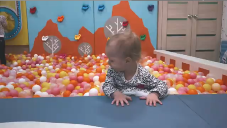 Здесь установлен сухой бассейн (и если постараться, то в нем можно делать заплывы), детский скалодром, батуты (фаворит вечеринки).