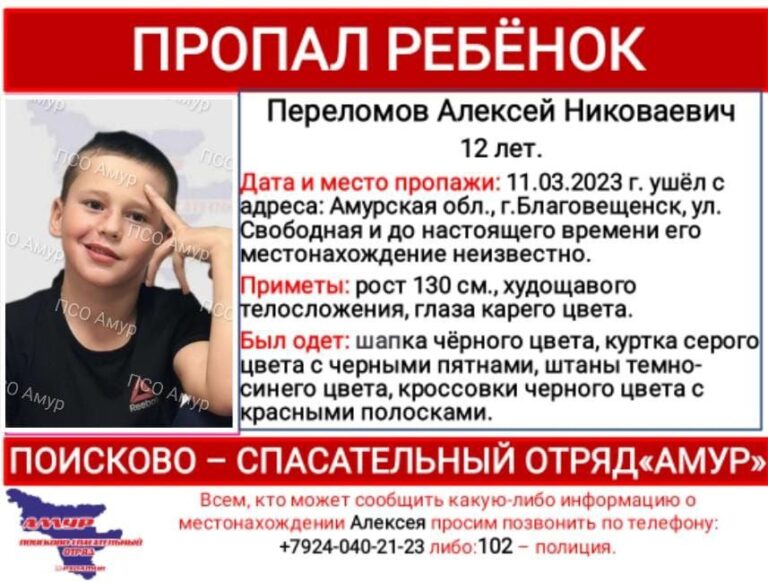 12 марта 2023, 10:27 В Благовещенске без вести пропал ребенок Поисково-спасательный отряд «Амур» опубликовал информацию о пропаже 12-летнего Алексея Переломова, жителя Благовещенска, который ушел из дома 11 марта 2023 года