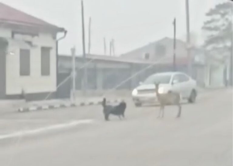 Видео снято на телефон, а авторы за кадром говорят, что всё происходит в районе «Автостиля» в Шимановске. Животное спасалось от нападающих бегством, скользя по замерзшим лужам.