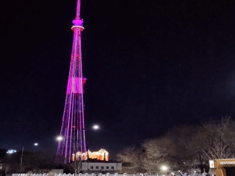 Иллюминация загорелась на телебашне 25 марта в 20:00 и украшала набережную в течение двадцати минут.