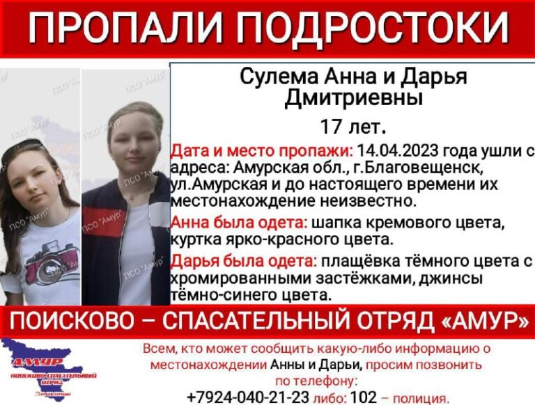 Поисково-спасательный отдряд «Амур» опубликовал информацию о пропаже семнадцатилетних сестер-близнецов. Анна и Дарья Сулема пропали днем в пятницу, 14 апреля.