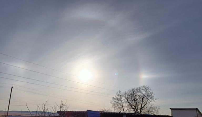 Жители села Поздеевка Ромненского района стали свидетелями солнечного гало. Небесное явление заметили в воскресенье утром, 16 апреля.