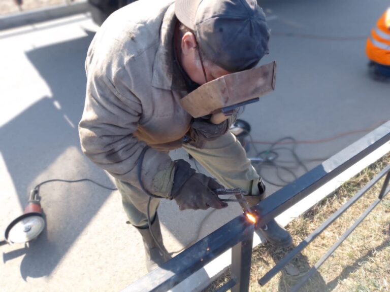 Сотрудники предприятия ремонтируют ограждение в районе пересечения улиц Театральной и Краснофлотской. Им предстоит заменить несколько поврежденных секций.