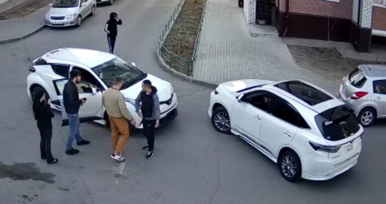 В позднем средневековье господа, которые не смогли разъехаться на узком мосту, уже начали бы хвататься за шпаги, но увы, шпаг нет. Водители покидают свои места и начинают спорить. При этом оба белых «коня» по непонятной причине так и остались стоять посреди двора с открытыми дверями, перегораживая и без того узкие проезды. В этот момент к массовке белых авто присоединяется владелец Lexus RX – ему просто некуда больше спешить, машины спорщиков перекрывают ему путь – ни объехать, ни перепрыгнуть. Подумав, Lexus сдаёт задним ходом явно не в ту сторону, куда собирался изначально.