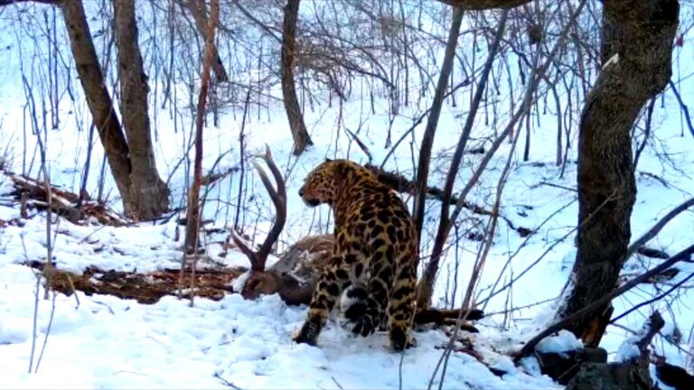 — Здоровый и упитанный хищник несколько дней сытно трапезничал крупной особью пятнистого оленя. Он регулярно возвращался в свою «столовую», заглядывая и на «ночной перекус». Хорошая физическая форма и навыки! Leo 252M успешно закрепился на участке у полуострова Гамова, в местах, где леопардов не видели уже много лет, – отметили в пресс-службе ФГБУ «Земля леопарда».