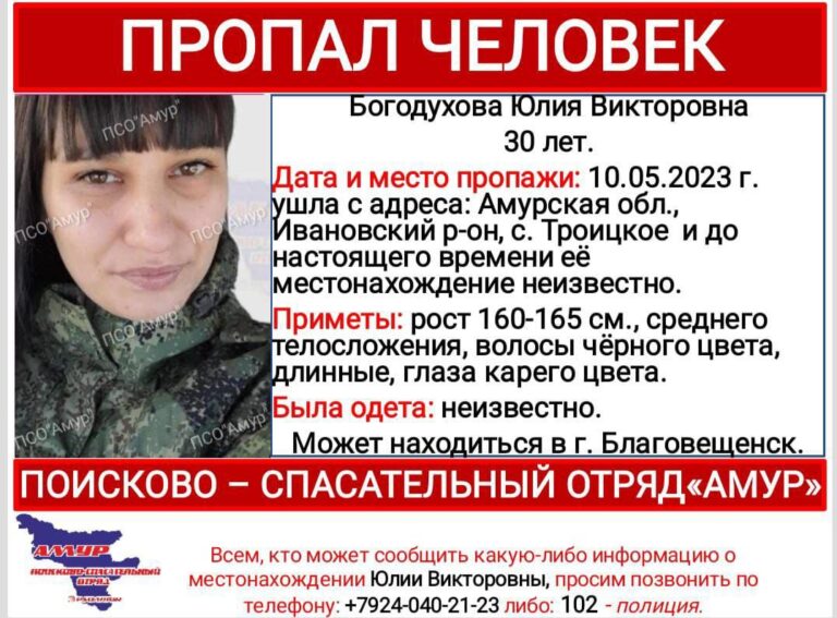 Женщину зовут Богодухова Юлия Викторовна. 10 мая она ушла из села Троицкого Ивановского района и до сих пор не вернулась. Предположительно она может находиться в Благовещенске.