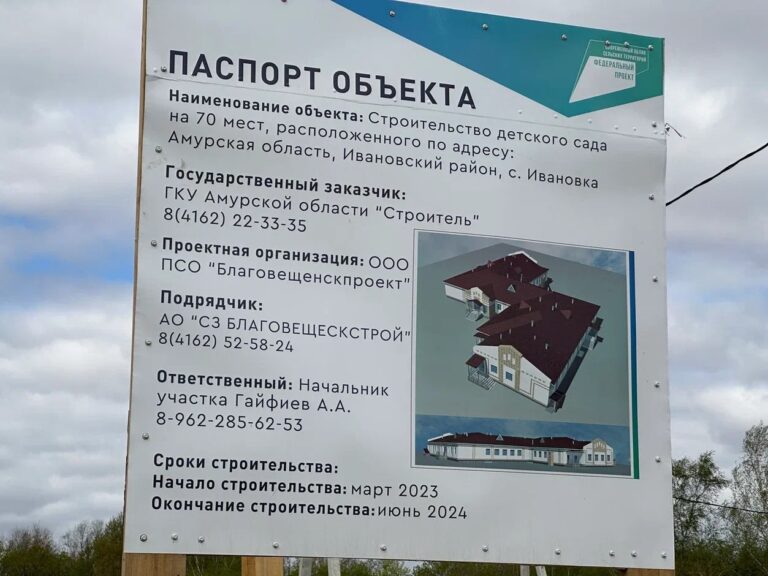 — Контракт с подрядной организацией заключили в марте, завершить все строительно-монтажные работы подрядчик должен летом следующего года. Детский сад будет одноэтажный, общей площадью порядка 2 400 квадратных метров. Стоимость контракта на строительно-монтажные работы – порядка 240 миллионов рублей, – уточнил начальник отдела строительного контроля ГКУ Амурской области «Строитель» Сергей Плотников.