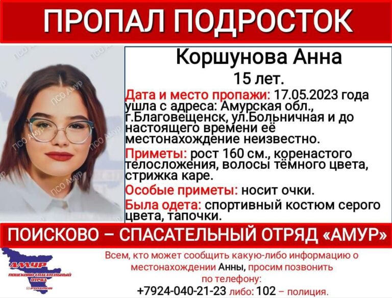 В среду, 17 мая, в Благовещенске пропала 15-летняя Анна Коршунова, её местонахождении до сих пор неизвестно, сообщает поисково-спасательный отряд «Амур».