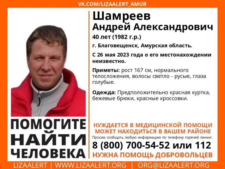 Около недели назад в амурской столице пропал 40-летний Андрей Шамреев. О местонахождении мужчины неизвестно с 26 мая. Информацию о поиске благовещенца опубликовал поисково-спасательный отряд «ЛизаАлерт» Амурской области.