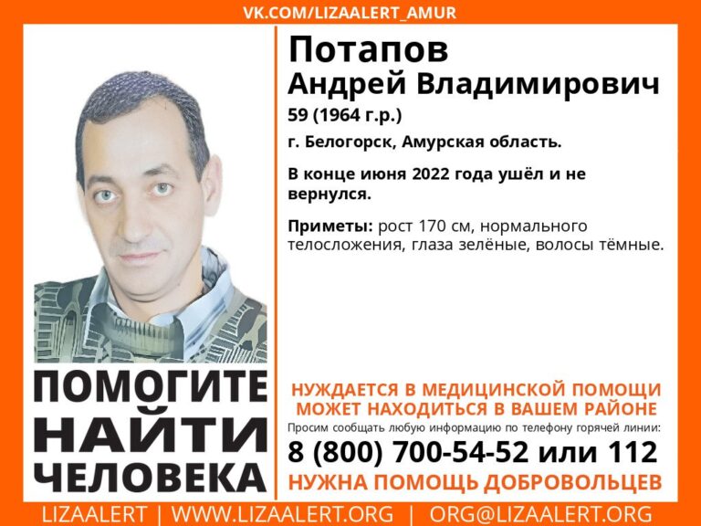 В конце июня прошлого года 59-летний Андрей Потапов ушёл из дома и не вернулся. Его разыскивают до настоящего времени.