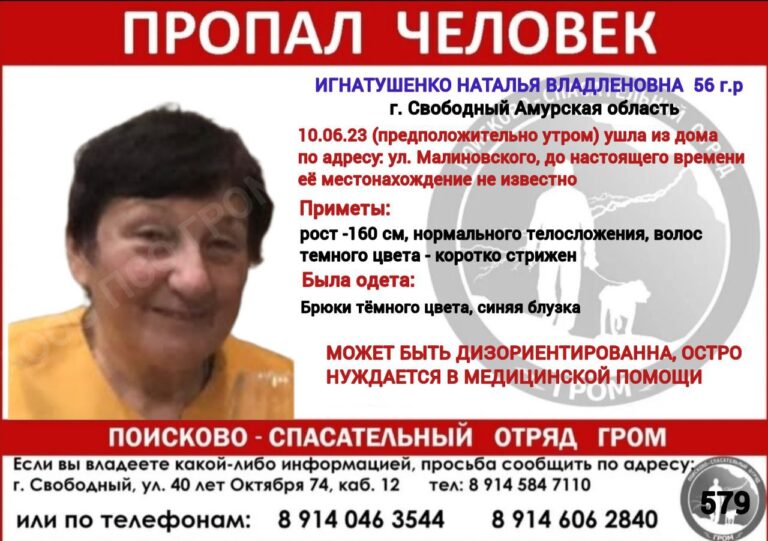В субботу, 10 июня, скорее всего в утреннее время в Свободном ушла из дома Наталья Владленовна Игнатушенко 1956 года рождения. Женщина может быть дезориентирована, сообщает поисково-спасательный отряд «ГРОМ».