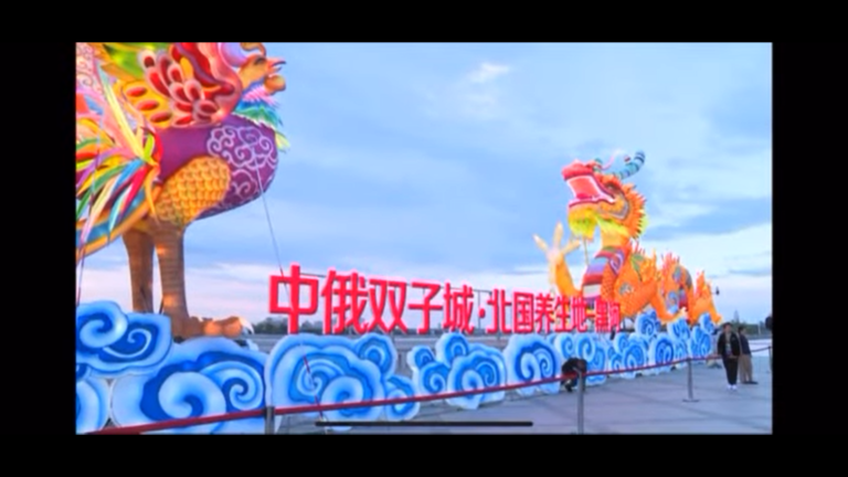 Местный китайский телеканал рассказал об одной из инсталляций. В сюжете показали дракона и жар-птицу, которые стоят друг напротив друга. Инсталляция символизируют танец по обоим берегам Амура. Кроме того, на кадрах можно увидеть иероглифы 中俄双子城 北国养生地 黑河, что переводится как «Китайско-российские города-близнецы, благодатные северные земли, Хэйхэ».