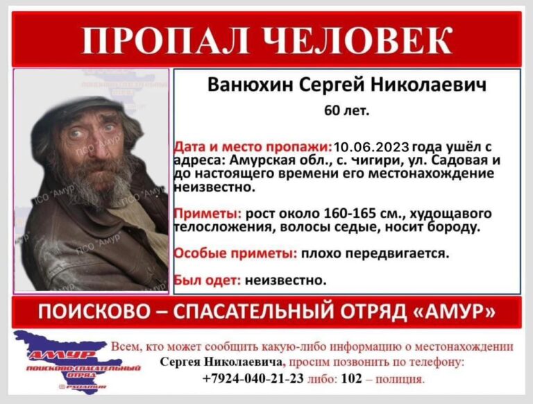 10 июня из дома на улице Садовой в селе Чигири ушёл 60-летний Сергей Николаевич Ванюхин, его местонахождение до сих пор неизвестно, сообщает ПСО «Амур».