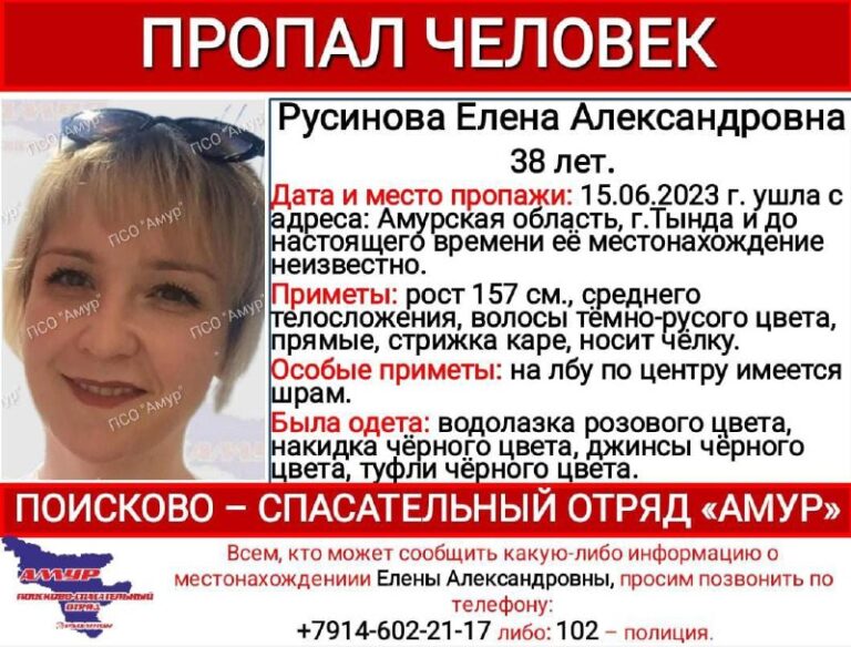 В Тынде 15 июня пропала 38-летняя Елена Александровна Русинова, о её местонахождении до сих пор ничего неизвестно, сообщает поисково-спасательный отряд «Амур».