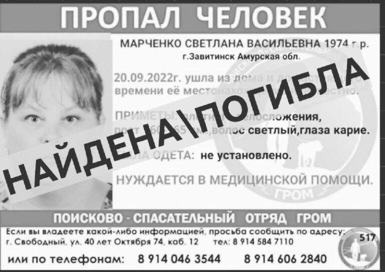 Жительницу Завитинска Светлану Марченко 1974 года рождения, которая пропала 20 сентября 2022 года, нашли погибшей в залинейной части города, сообщает поисково-спасательный отряд «Гром».