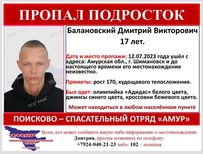 Поисково-спасательный отряд «Амур» разместил в своём телеграм-канале ориентировку на пропавшего без вести Дмитрия Викторовича Балановского.