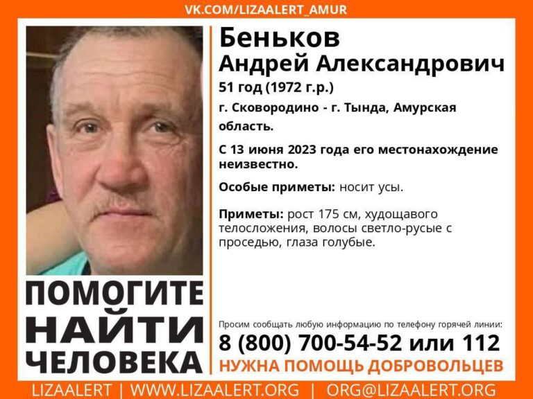 Волонтёры поисково-спасательного отряда «ЛизаАлерт» продолжают поиски 51-летнего Бенькова Андрея Александровича, местоположение которого с 13 июня неизвестно.