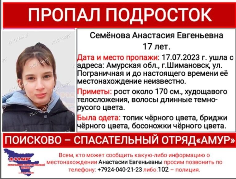 В Шимановске пропала 17-летняя девушка. Анастасия Семёнова исчезла вчера, 17 июля, сообщает поисково-спасательный отряд «Амур».