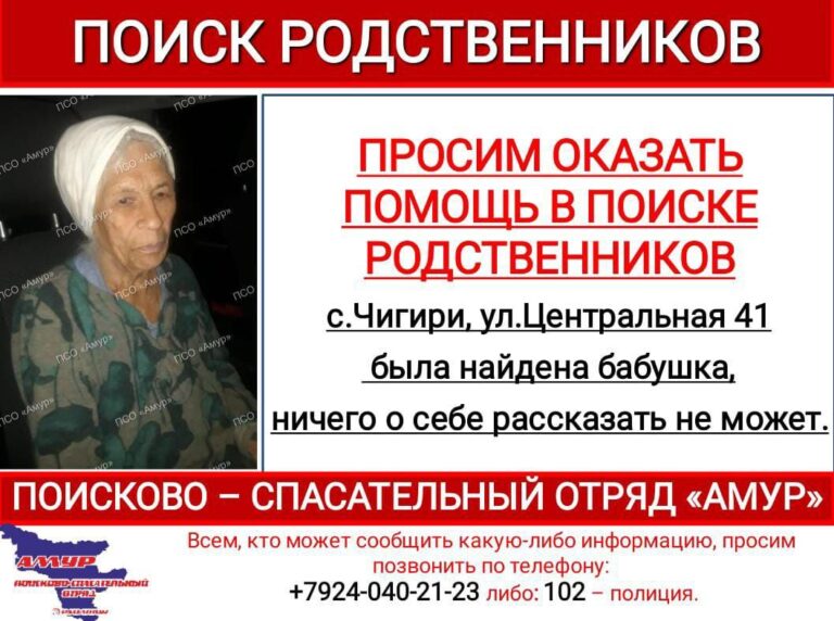 Волонтеры ПСО «Амур» просят неравнодушных амурчан помочь в поиске родственников потерявшейся женщины. Её нашли в районе улицы Центральной, 41 села Чигири.