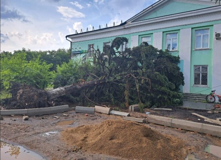 Первая гроза и всё!: в амурском посёлке у места дорожных работ упала многолетняя ель