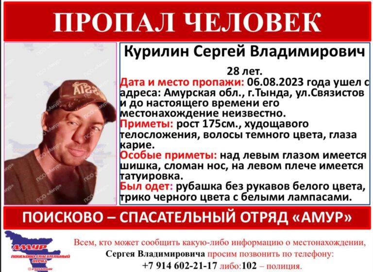 В поисково-спасательном отряде уточнили, что Сергей работал в Тынде вахтовым методом. 6 августа он ушел с территории предприятия, расположенного на улице Связистов, и пропал. Сумка с вещами мужчины осталась на предприятии. До сих пор местоположение Сергея неизвестно.