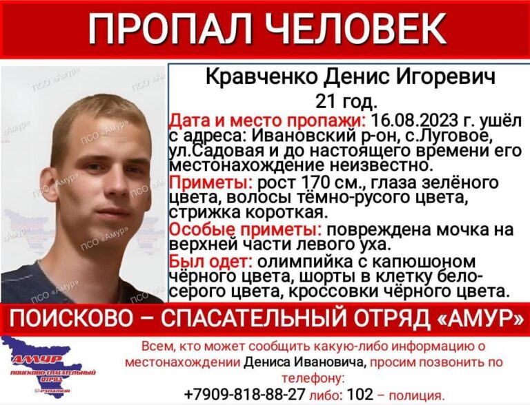16 августа в селе Луговое Ивановского района пропал 21-летний Денис Кравченко. Об этом сообщили в ПСО «Амур».