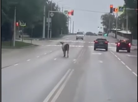 На кадрах короткого ролика видно, как испуганное животное мечется между полосами проезжей части, а на шее у него болтается кусок оторванной верёвки.