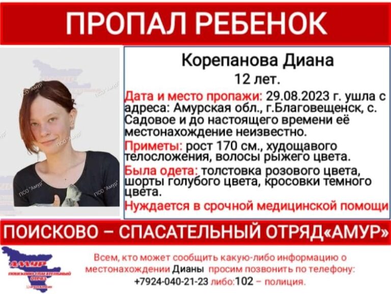 12-летняя девочка была одета в розовую толстовку, голубые шорты и темные кроссовки. Благовещенка нуждается в медицинской помощи.