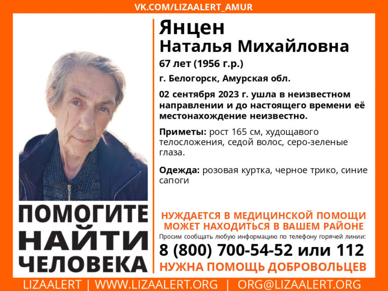 67-летняя Наталья Михайловна Янцен ушла из дома в Белогорске 2 сентября и до сих пор о её местонахождении ничего не известно, сообщили в ДПСО «ЛизаАлерт».