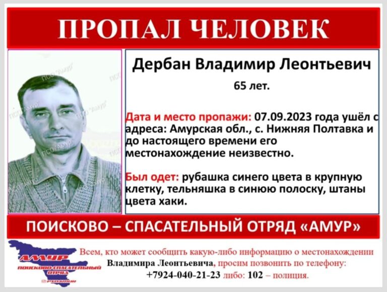 7 сентября из дома в селе Нижняя Полтавка Амурской области ушёл 65-летний Владимир Леонтьевич Дербан. Как сообщили в ПСО «Амур», о местонахождении мужчины до сих пор ничего неизвестно.
