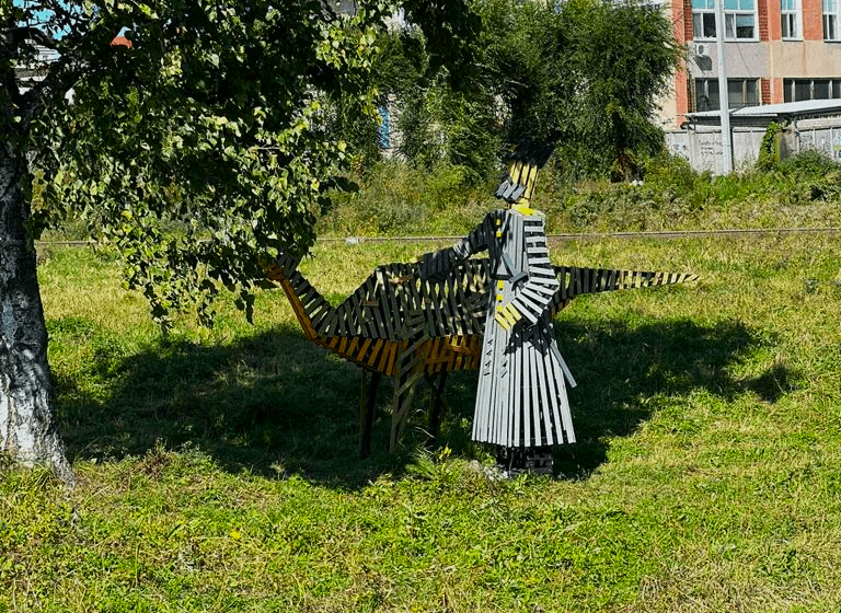 — Ехала сегодня по привычному маршруту и в районе калининского переезда растерялась. Возле уже привычного деревянного амурозавра казак стоит. Что хотели сказать авторы этой композиции? Казак хочет оседлать динозавра? Или это не казак?, – вопрошает наша читательница.