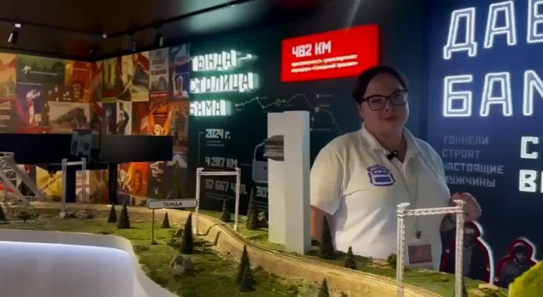 Гостям амурского павильона рассказали об истории Байкало-Амурской магистрали – это всесоюзная стройка, в которой поучаствовало более полумиллиона человек, 34 из которых были представлены к званию Героя Социалистического труда. Часть экспозиции посвящена этим людям: Ивану Варшавскому, Александру Бондарю и другим. Гостям рассказывают о столице БАМа – Тынде, где 30 % трудоспособного населения работают на предприятиях Российских железных дорог.