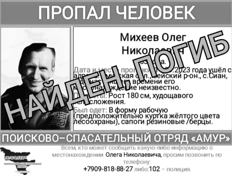 Волонтеры поисково-спасательного отряда «Амур» сообщили, что пропавшего 11 сентября жителя села Сиян Зейского района Олега Михеева нашли мертвым – эту информацию им предоставили родственники.