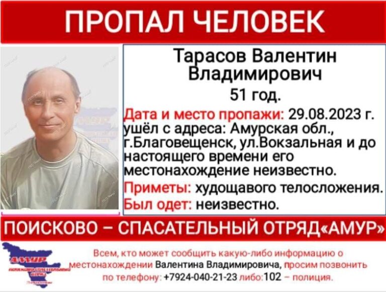Всем, кто видел пропавшего, просят сообщить об этом в полицию (телефон 102) или в поисково-спасательный отряд «Амур» по номеру +7-924-040-21-23.