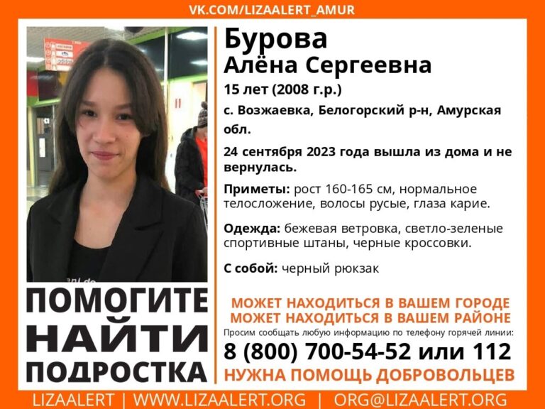 В Приамурье разыскивают 15-летнюю девушку-подростка. Алёна Бурова исчезла сегодня, 24 сентября, родные запросили помощи у полиции и поисковиков.