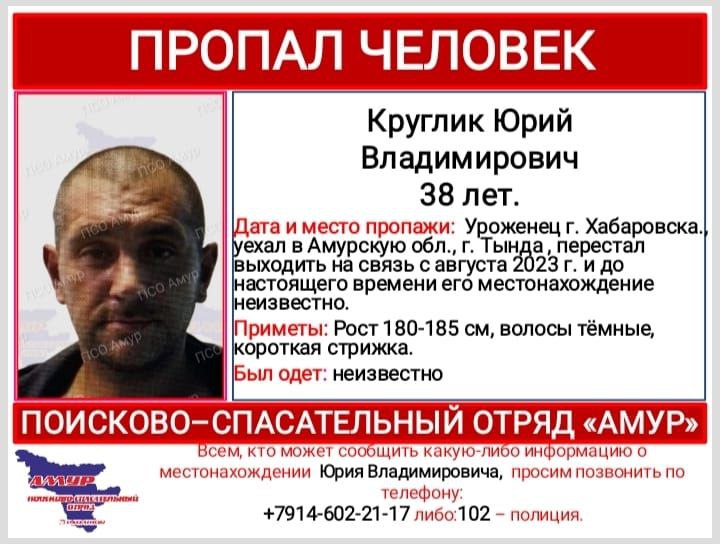 Как сообщает ПСО «Амур», 38-летний Юрий Владимирович Круглик из Хабаровска уехал в Тынду. Однако последние два месяца о его местонахождении ничего не известно.