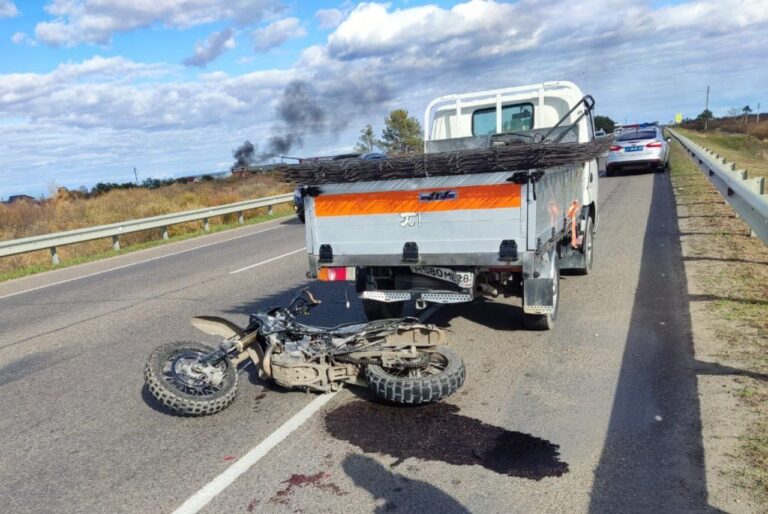По предварительной информации, 38-летний водитель мотоцикла при обгоне автомобилей врезался в стоящий на обочине грузовой автомобиль Toyota Hiace.