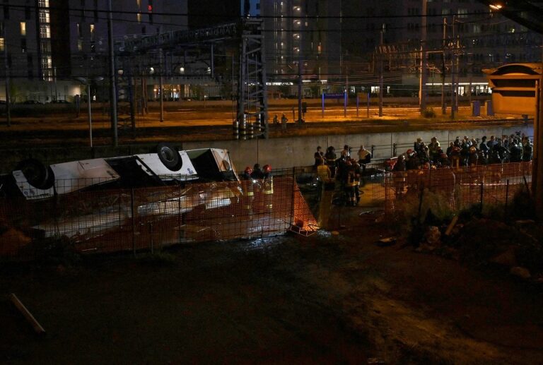 В районе железнодорожной станции Местре пассажирский автобус пробил дорожное заграждение и упал с эстакады на железную дорогу. Транспортное средство загорелось, зацепив электрические провода.