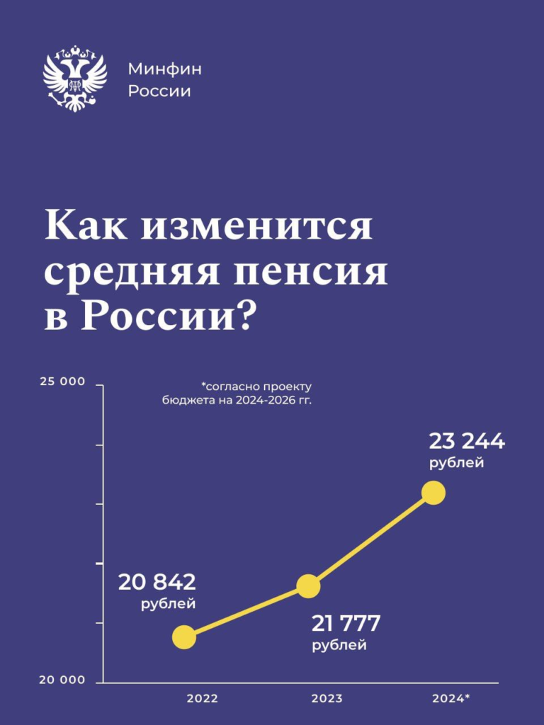 При этом, исходя из инфографики, опубликованной в официальном телеграм-канале министерства финансов, следует, что рост пенсии с 2022 по 2024 года составит 2 402 рубля (с 20 842 рублей до 23 244 рублей). В текущем 2023 году средняя пенсия в России составляет 21 777 рублей.