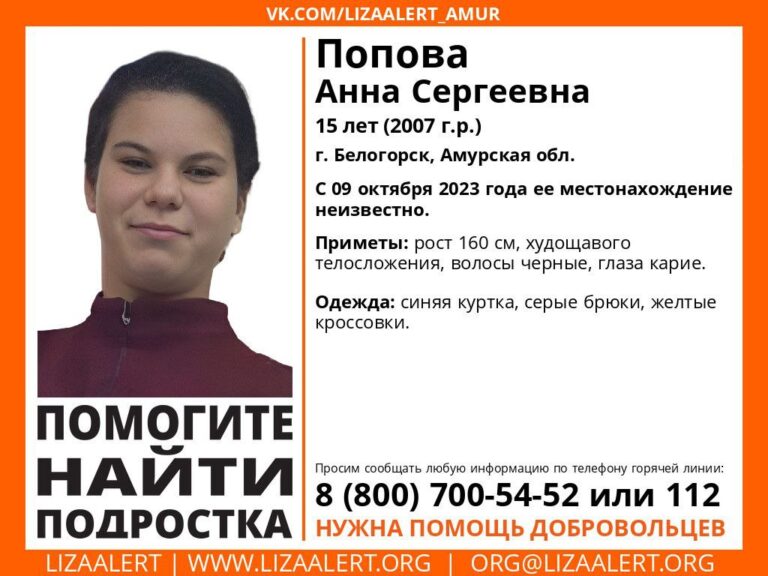 В понедельник, 9 октября, в Белогорске пропала 15-летняя Анна Сергеевна Попова. Её местонахождение до сих пор неизвестно, сообщает поисковый отряд «ЛизаАлерт».