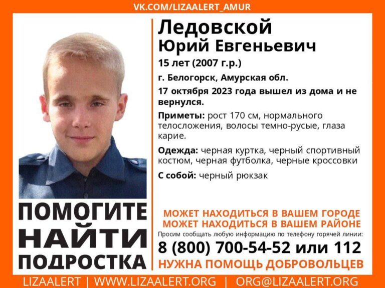 В Белогорске ищут 15-летнего Юрия Евгеньевича Ледовского. Подросток пропал во вторник, 17 октября. Он вышел из дома, но обратно не вернулся. О поисках сообщил добровольческий поисково-спасательный отряд «ЛизаАлерт».