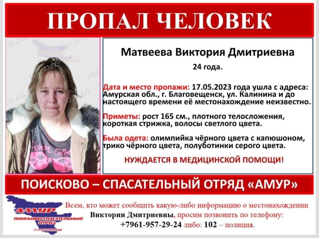 Поисково-спасательный отряд «Амур» разместил ориентировку на пропавшую без вести Викторию Матвееву. Девушка ушла из дома ещё в мае текущего года, но поиск после обращения родственников объявлен только сейчас.