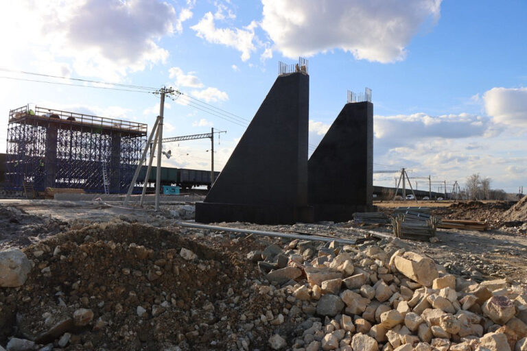 Строители завершили монтаж буронабивных столбов и сейчас возводят опоры путепровода. Уже готовы две из четырех. На площадку завозят материалы и пролётные строения, которые затем методом продольной надвижки установят на опоры.