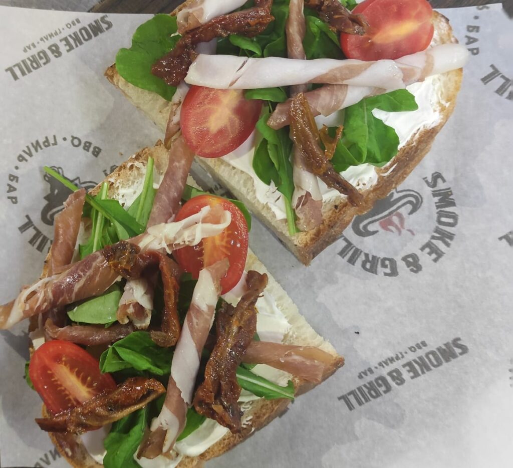 На ломтики хлеба (багета, чиабатты) мажем сыр и выкладываем эстетично остальные ингредиенты. Ярко, сытно и очень вкусно.