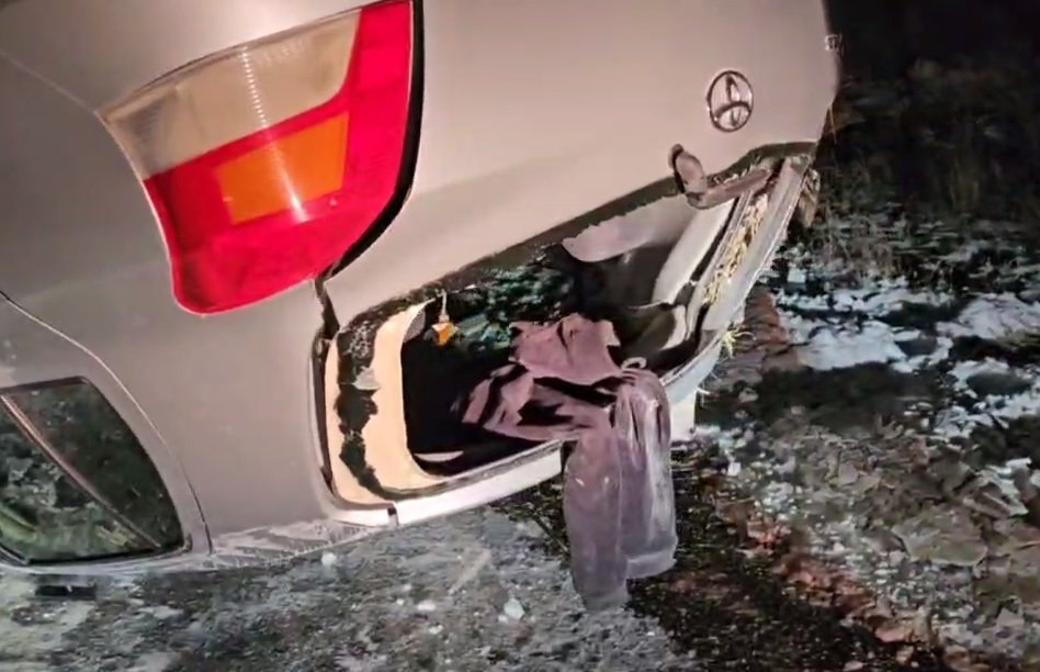 С высокой вероятностью, рамки боковых дверей оказались прижаты к дороге, поэтому водитель выбрался из авто, разбив стекло в двери багажника.
