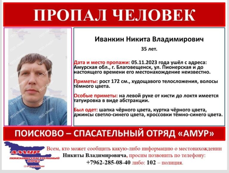 Сегодня, 5 ноября, в Благовещенске пропал 35-летний Иванкин Никита Владимирович. Мужчина ушёл с адреса на улице Пионерской. О его поисках сообщил поисково-спасательный отряд «Амур».