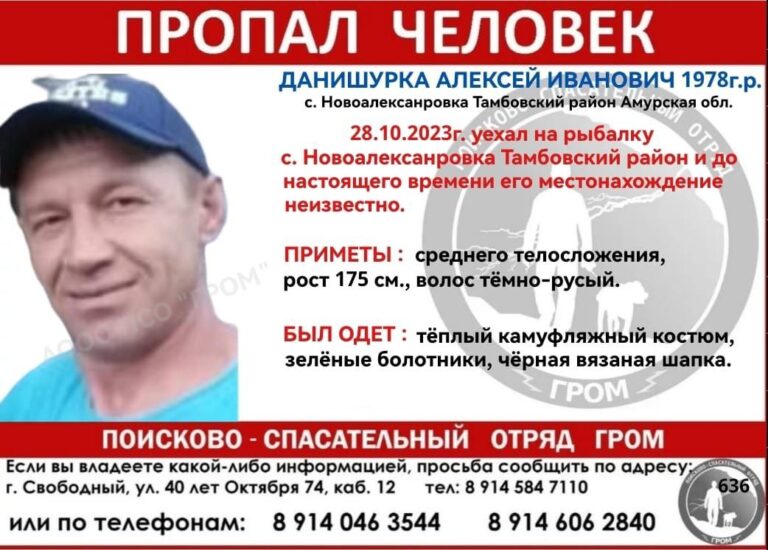 45-летний Алексей Иванович Данишурка пропал в ночь с 28 на 29 октября на дамбе в селе Новоалександровка Тамбовского района.